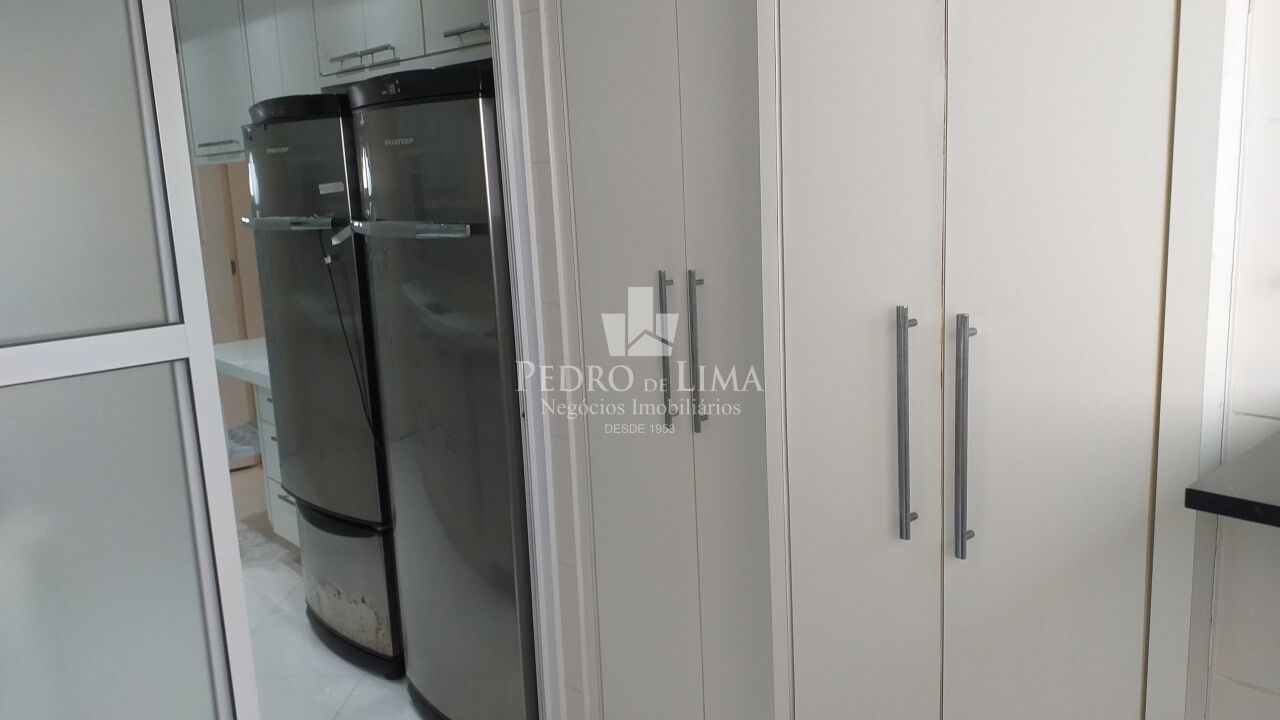 ampla cozinha bem moderna, repleta de armários e toda equipada com geladeira, freezer, microondas, fogão de indução e depurador de ar;