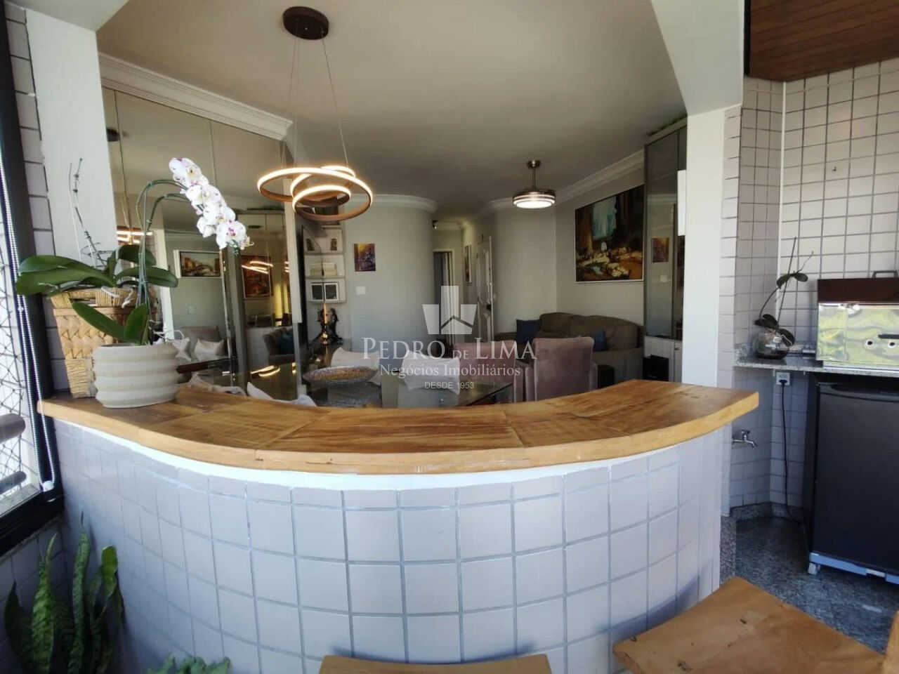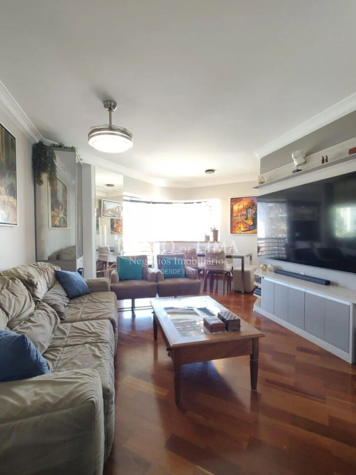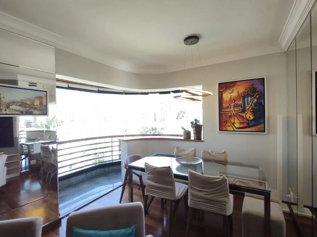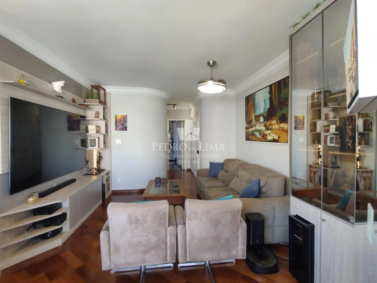 Sala dois ambiente, com piso de madeira Jatobá, móveis planejados, lavabo.